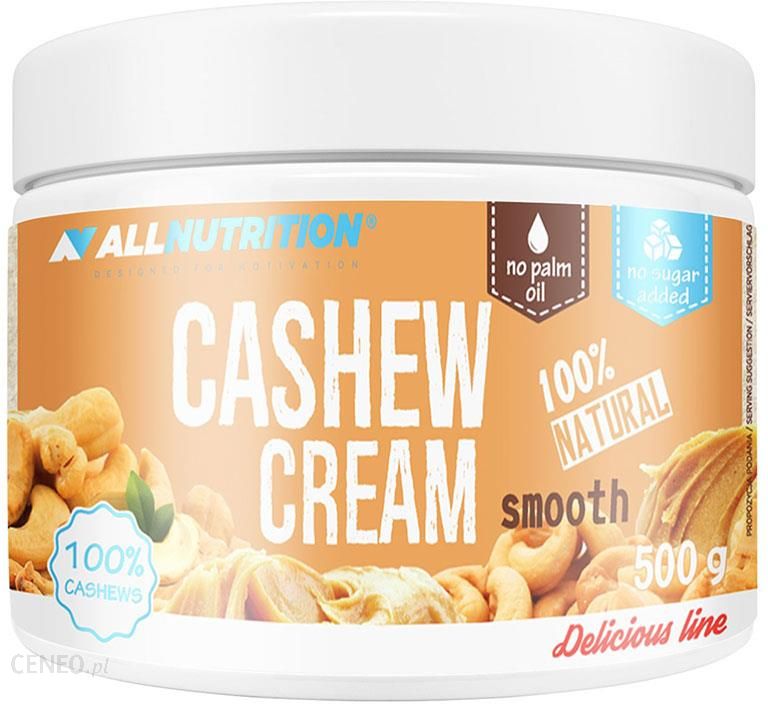 ALLNUTRITION CASHEW CREAM SMOOTH to w 100% naturalny krem z orzechów nerkowca o wysokiej zawartości białka, tłuszczów nienasyconych i witamin z grupy B.Nerkowce, podobnie jak inne orzechy zawierają duże ilości tłuszczu ale znaczna część tłuszczów znajdujących się w orzechach nerkowca należy do grupy nienasyconych kwasów tłuszczowych. Kwas oleinowy posiada korzystny wpływ na funkcjonowanie układu krążenia, również u osób chorych na cukrzycę.Tabela składu:Wielkość opakowania: 500 gWielkośc porcji: 25 gIlość porcji w opakowaniu: 20Wartość odżywcza: w 25 g %RWSWartość energetyczna : 151 kcalTłuszcz 11 g 16%- w tym nasycone 2 g 10%Węglowodany 8,2 g 2%- w tym cukry 1,5 g Błonnik 0,8 gBiałko 4,6 g 9%Sól 0,01 g 0%% RWS – Referencyjna wartość spożycia dla przeciętnej osoby dorosłej (8400 kJ/2000 kcal)Składniki:Orzechy nerkowca 90%, olej rzepakowy 10%Alergeny: zawiera orzechy nerkowca, może zawierać mleko, soję i inne orzechy. Niska zawartość soli.Sposób użycia:W zależności od zapotrzebowania.Zawartość soli wynika wyłącznie z obecności naturalnie występującego sodu. Cukier i sól pojawiające się w składzie występują naturalnie w orzechach. Na powierzchni masła może wytrącać się cenny i aromatyczny olej. Rekomendujemy wymieszanie masła przed spożyciem.Przechowywanie:Przechowywać w temperaturze pokojowej, w zamkniętym opakowaniu, w suchym miejscu. Chronić przed bezpośrednim działaniem promieni słonecznych. Przechowywać w miejscu niedostępnym dla małych dzieci.