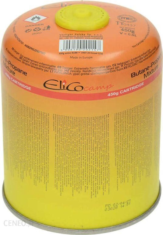 Kartusz gazowy ElicoTech 450gr Kartusz gazowy 450gr gwarantuje stabilny płomień, niezależnie od warunków panujących w otoczeniu. Zawór jest tak skonstruowany, że po dokręceniu urządzenia np. kuchenki gazowej sam się otwiera i następuje wypływ gazu. Po odkręceniu zawór sam się zamyka. Średnica gwintu wewnętrznego: 10mm, 7/16″. Standard gwintu wg EN 417 dla wszystkich kartuszy butanowych ,izobutanowych, propanowych, mixów. Wymiary: średnica 11cm, wysokość 14cm