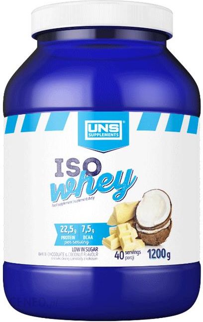 UNS Iso Whey – przepyszna odżywka wysokobiałkowa składająca się z koncentratu białka serwatkowego (WPC 80) z dodatkiem izolatu białka serwatkowego (WPI 90) cechująca się wysoką wartością biologiczną oraz dużą aktywnością anaboliczną. Zawiera w każdej porcji (30 g): aż 22,5 g białka, zaledwie 2,1 g węglowodanów, oraz jedynie 1,2 g tłuszczu. UNS Iso Whey został stworzony z myślą o sportowcach, osobach trenujących rekreacyjnie oraz zwolennikach zdrowego odżywiania. Jest idealnym dopełnieniem codziennej diety w łatwo przyswajalne białko, które skutecznie chroni mięśnie przed katabolizmem, przyśpiesza regenerację, korzystnie wpływa na układ odpornościowy oraz pomaga w utrzymaniu zdrowych kości. Serwatka użyta do produkcji białka UNS Iso Whey została poddana procesowi instantyzacji dzięki czemu produkt rozpuszcza się idealnie bez najmniejszych problemów. Kolejnym odczuwalnym plusem dla konsumenta podczas przygotowywania koktajlu z UNS Iso Whey jest brak piany oraz grudek. UNS Iso Whey cechuje niesamowicie kremowy smak. Produkt występuję w ponad 10 zróżnicowanych wariantach smakowych co pozwoli zaskoczyć nawet najbardziej wymagające podniebienia. UNS Iso Whey jest pozbawiony glutenu, soi, tanich wypełniaczy, zagęstników a nawet barwników. Jest słodzony wyłącznie sukralozą dzięki czemu nie musisz się martwić o zgagę czy inne dolegliwości żołądkowe. O najwyższej jakości produktu UNS Iso Whey świadczy również brak dodatku cukru w składzie. Cukry występujące w produkcie są wyłącznie naturalnego pochodzenia. Idealnie sprawdzi się również w trakcie redukcji tkanki tłuszczowej jako baza do proteinowych koktajli czy dodatek do omletów, ciast czy innych wypieków.Jakie smaki są najczęściej wybierane przez Klientów?Niewątpliwie hitem sprzedażowym jest ciastko z kremem oraz biała czekolada. Te smaki nie tylko wybierane są najczęściej podczas pierwszych zakupów. Mnóstwo Klientów tak bardzo chwali sobie te smaki, że przy kolejnych zakupach sięga po nie ponownie. To dowód, że białko Iso Whey nigdy się nie nudzi. Chce przytyć, czy stosowanie odżywki białkowej mi w tym pomoże?Białko pełni kluczową rolę w budowie mięśni i tkanek. Z uwagi na to, że budowanie beztłuszczowej masy mięśniowej jest procesem złożonym nie można stwierdzić, że samo spożywanie białka zagwarantuje wzrost masy mięśniowej. Aby zbudować mięśnie należy mieć dobrze dobraną dietę oraz plan treningowy. Odżywka białkowa z pewnością pomoże w utrzymaniu odpowiedniej ilości białka w diecie. Ile białka powinienem przyjmować w okresie budowy beztłuszczowej masy ciała?2,5 g białka na kilogram masy ciała to odpowiednia ilość białka podczas okresu budowania masy ciała.