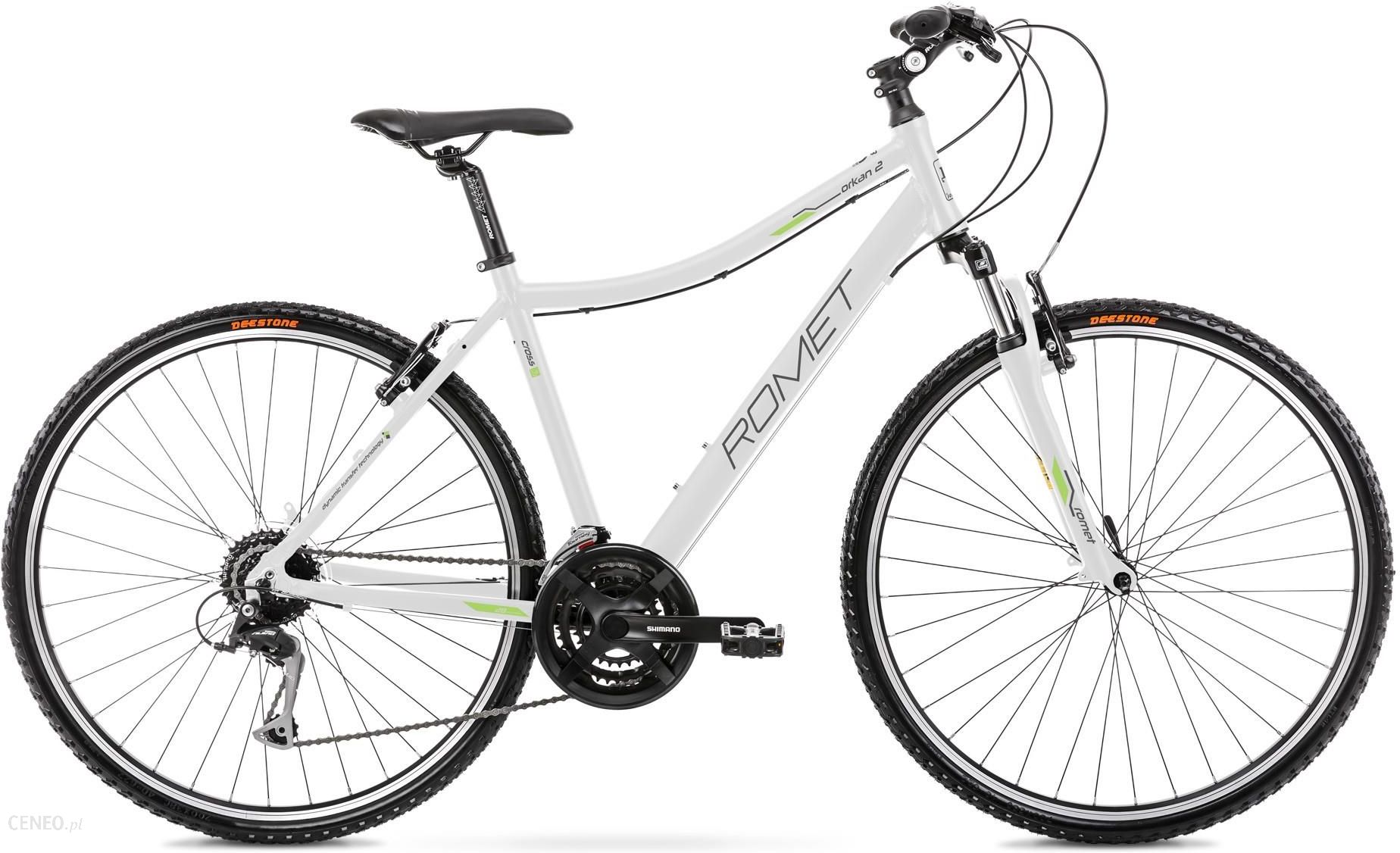 ORKAN 2 DKategoria: CROSSMarka: RometModel: Orkan 2 DKolor: biały-seledynowyRozmiar ramy: 19 LSPECYFIKACJAKoła, rama28″ / alu 6061RozmiarS – 15″ / M – 17″ / L – 19″WidelecamortyzowanyNapęd24 biegiManetki przódShimano ST-EF500 3 speedManetki tyłShimano ST-EF500 8 speedPrzerzutka przódShimano FD-TY510Przerzutka tyłShimano Alivio RD-T4000Mechanizm korbowyShimano FC-M301 48/38/28 170/175 mmHamulec przódV-brake Promax TX117 aluminiowyHamulec tyłV-brake Promax TX117 aluminiowyOpony700×42Obręczealuminiowe dwukomorowePiasta przódShimano HB-TX500Piasta tyłShimano FH-TX500Kaseta/wolnobiegShimano CS-HG200 12-32T 8 speedKierownicaaluminiowa 680 mm 15 31,8 mmMostek kierownicyaluminiowy 90 mmSztycastalowa 31,6 mm 350 mmSiodłoVaderPedałyFP-804Waga13,9 kg